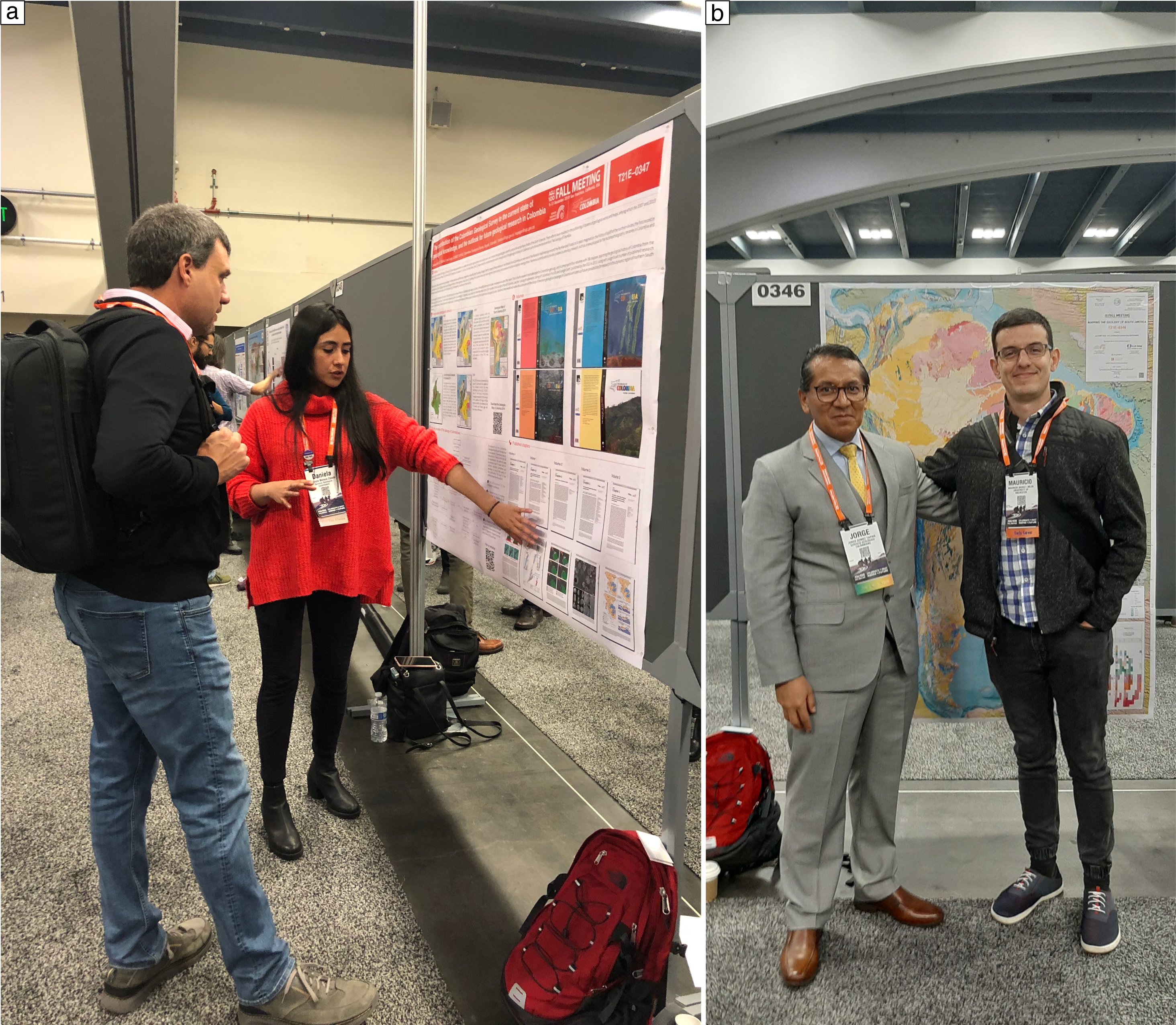 Presentación de los pósteres del SGC. (a) Póster “The contribution of the Colombian Geological Survey to the current state of geological knowledge, and the outlook for future geological research in Colombia” presentado por Daniela Mateus Zabala; (b) póster “Mapping the geology of South America” presentado por Jorge Gómez Tapias. Junto a él, el profesor Mauricio Ibáñez de la Universidad de Rochester, EE. UU.